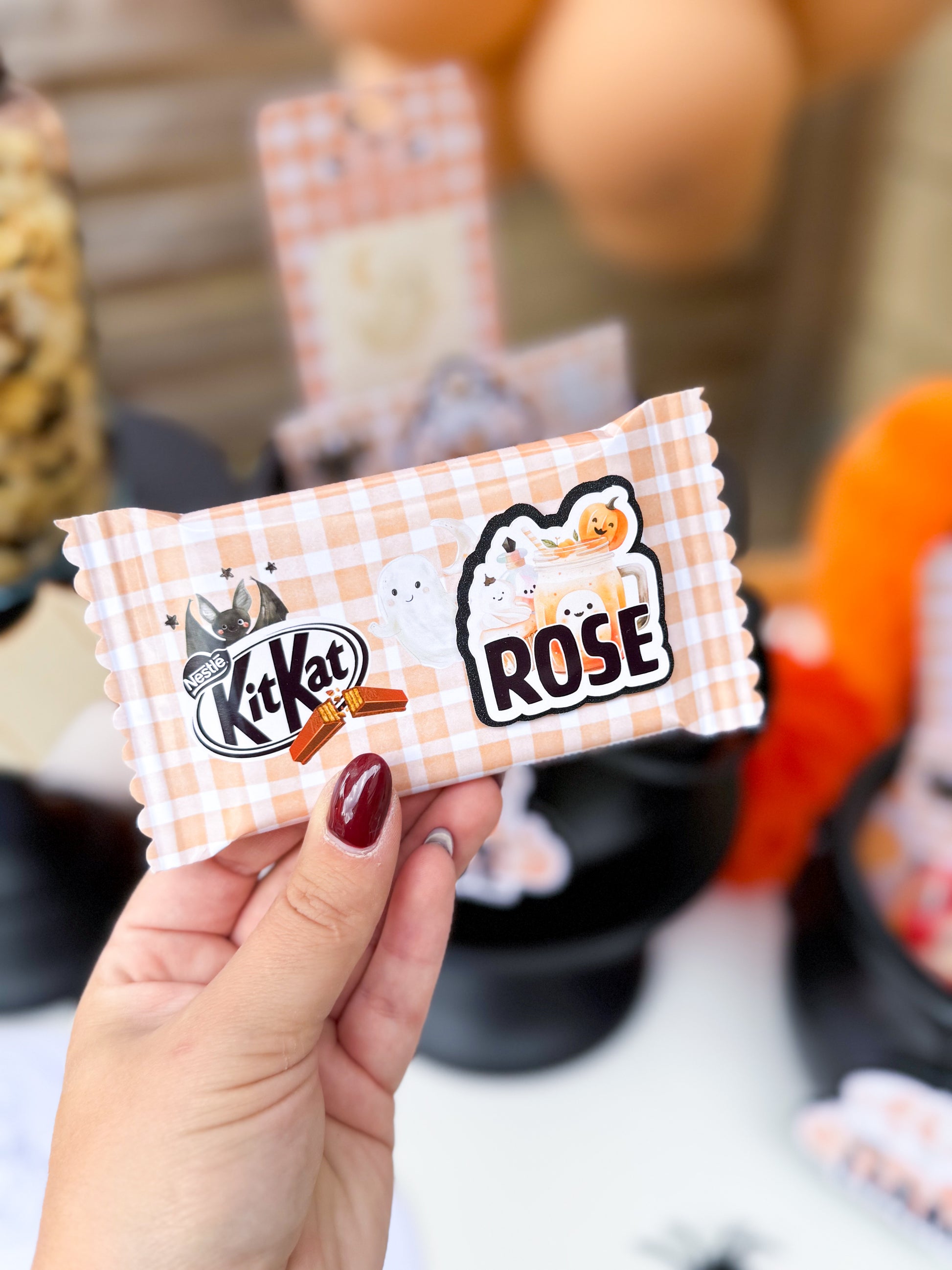 - Un gourmandise chocolatée KitKat aux couleurs d'Halloween, elle aussi personnalisée.